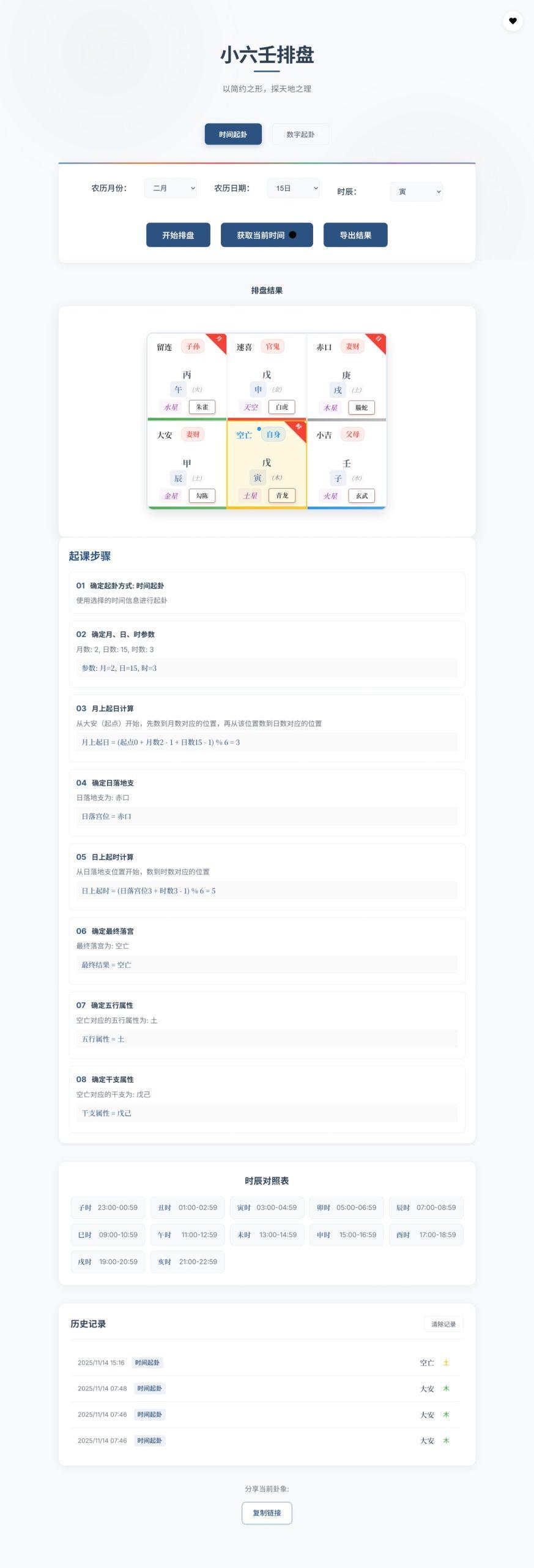 双起卦方式:时间起卦(选农历月/日/时辰)+ 自动获取当前时间自动计算排盘:含宫位、干支、六亲、星宿等完整结果附带起课步骤解析+时辰对照表,新手友好支持排盘导出、历史记录留存技术&工具前端:纯原生 HTML+CSS+JavaScript(无框架,直接运行)