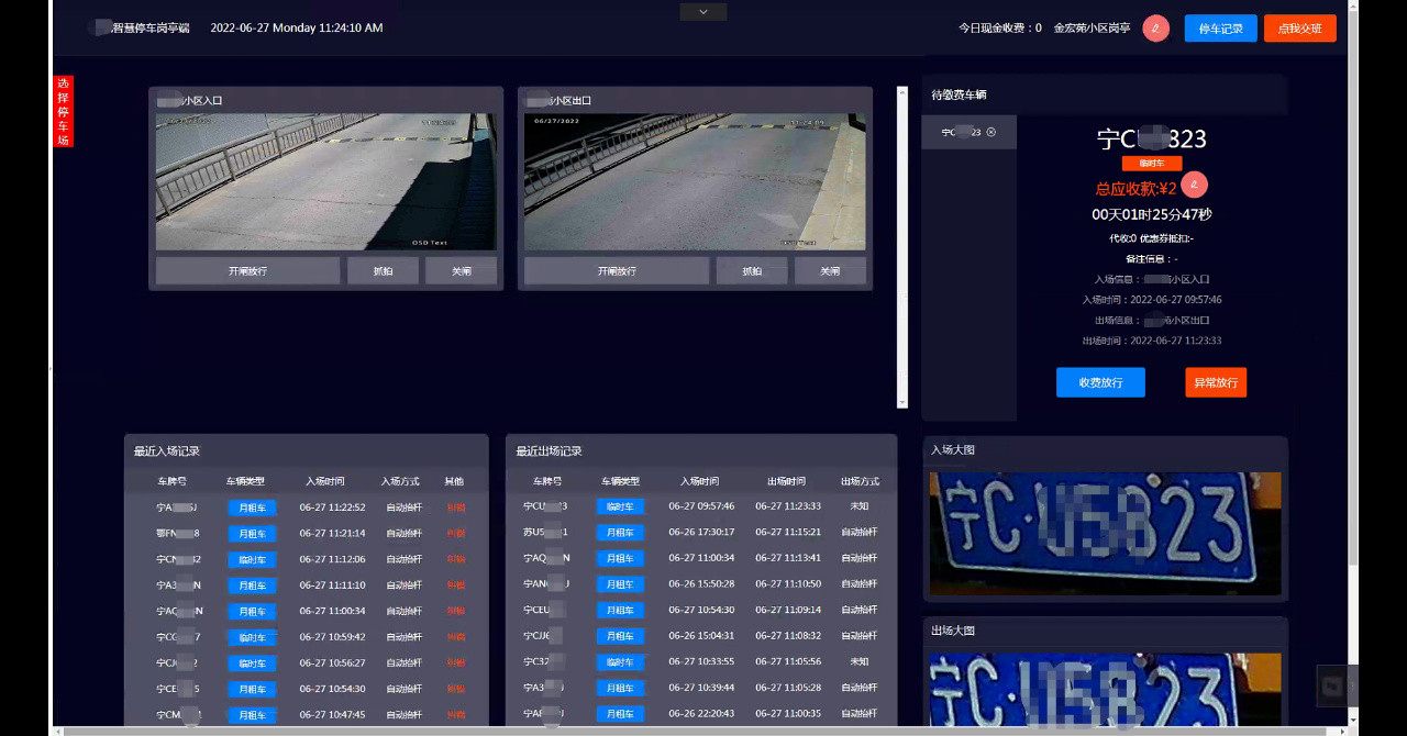 车辆进出数据实时推送,基于websocket协议通讯,支持优惠设置,现金收费,一键异常放行,车牌纠错,停车记录查看,车辆进出图片显示和查看,局域网视频留超低延时监控播放(无视品牌,任何相机都能使用)等