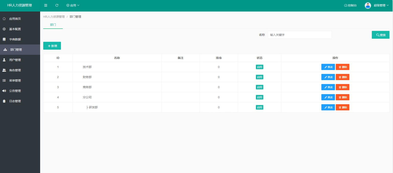 配置端:自定义角色和权限,自定义附件上传文件类型,字典管理、部门管理、数据统计、操作日志